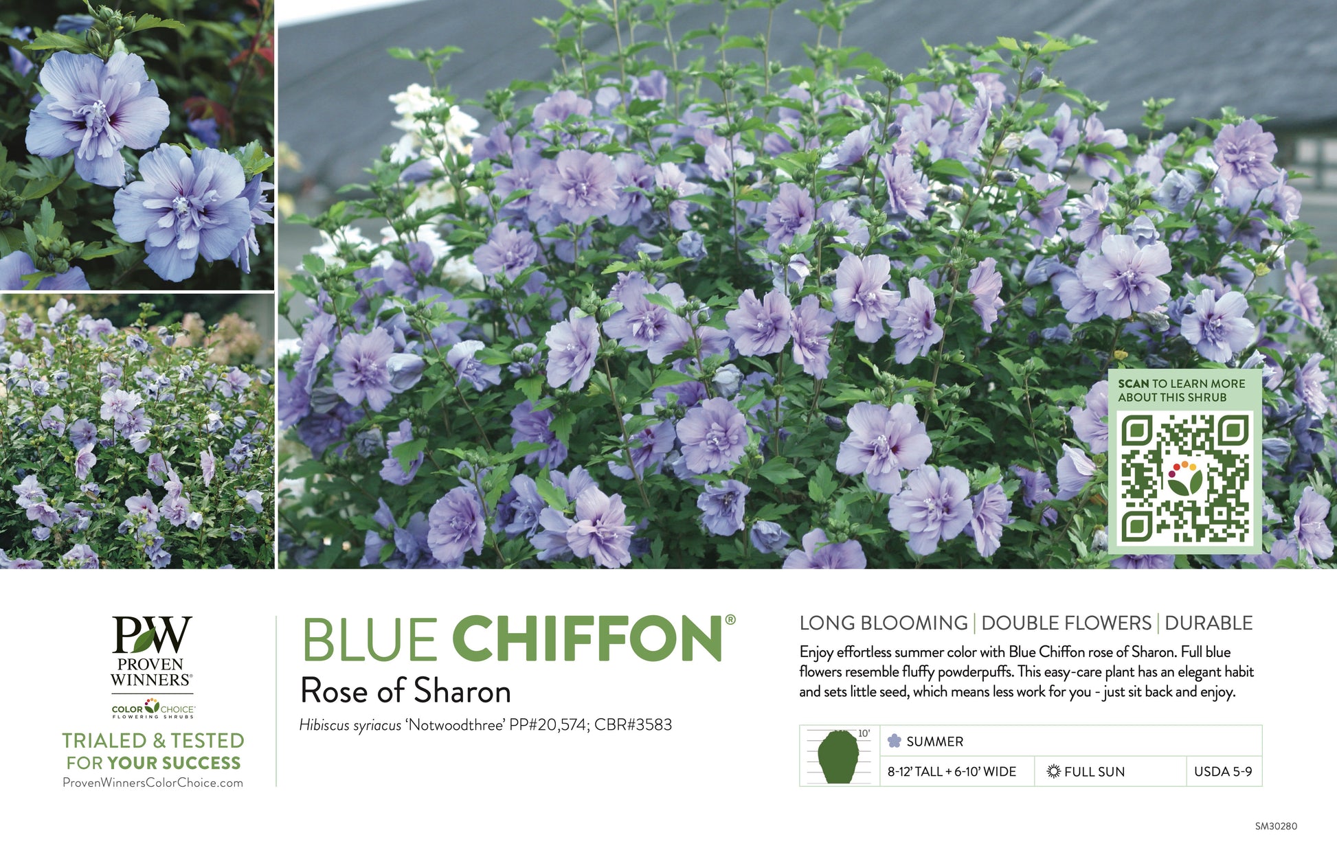 Rich blue summer flowers. The Chiffon® series of rose of Sharon is distinguished by its elegant habit, floriferous nature, and anemone-like double blooms. Blue Chiffon® rose of Sharon brings an always-popular true blue to the line. Low seed set and long blooming.