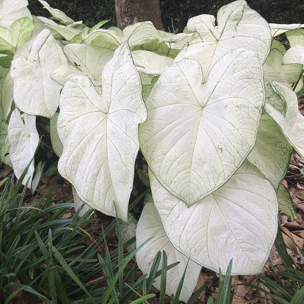 Caladium brings vivid color to the shade garden with leaves ranging from white to vivid red and everything in-between. 'Garden White' features white, heart-shaped leaves, that brighten shady borders. Beautiful in pots, too!