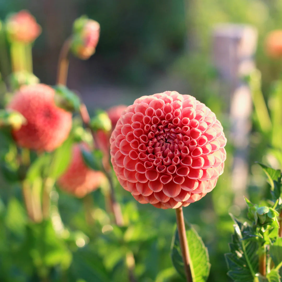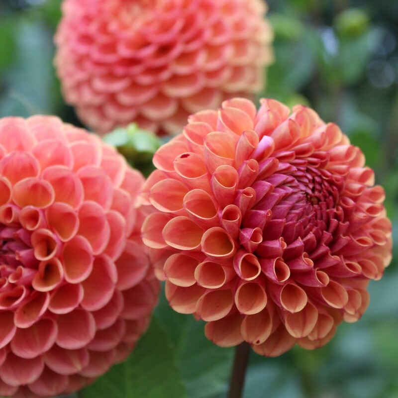 'Cornel Bronze' explodes with 3" ball-shaped flower with orange/bronze petals in a tight spiral from summer to fall. Very productive, blooming all season long on strong, straight stems.