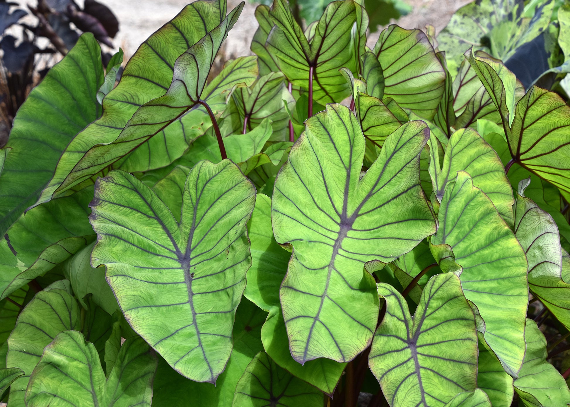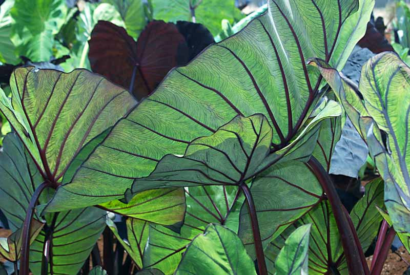 Grown for its striking, tropical foliage, elephant ear is a native of eastern Asia with thick, glossy, heart-shaped leaves in a striking dark chocolate color. 'Blue Hawaii' sports large, heart-shaped leaves with deep blue/purple veining on burgundy stems. Makes a dramatic focal point or plant en masse for maximum effect. Plant in pots for a tropical vibe on patios and porches.